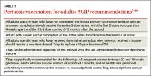 The 2 vaccines used to prevent pertussis are DTaP (diphtheria-tetanus-acellular pertussis) and Tdap (tetanus-diphtheria-acellular pertussis). The difference between the 2 is that the Tdap vaccine contains a reduced dose of the diphtheria and acellular pertussis vaccines. DTaP is designed primarily for children younger than 7 years of age. Tdap is given to older children and adults. The CDC and Advisory Committee on Immunization Practices recommend that children receive 5 doses of DTaP, one dose at each of the following ages: 2, 4, 6, and 15 to 18 months and at 4 to 6 years.7 All adults 19 years of age and older who have not yet received a dose of Tdap should receive a single dose regardless of when they last received any immunization for tetanus or diphtheria.7-10 A one-time Tdap booster should be given to all adults in place of a tetanus booster (TABLE 1).7-10