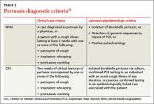 TABLE 216 outlines the clinical and laboratory diagnostic criteria for pertussis from the CDC and the World Health Organization. Suspect pertussis in a patient who’s had a cough for more than 14 days that includes an inspiratory “whoop.” In infants, pertussis should be suspected in those with symptoms that suggest cough and associated apnea.16 Order laboratory testing for any patients who have clinical signs or symptoms of pertussis.