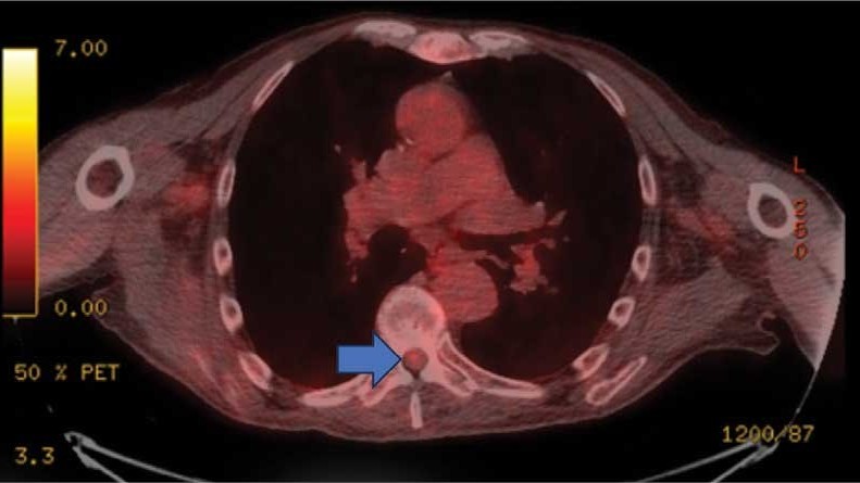 On admission, neurology evaluated the patient’s lower extremity strength as 5/5 on his left, 1/5 on his right hip, and 2/5 on his right knee, with hypoesthesia of his right lower extremity. Computed tomography (CT) with contrast of the chest, abdomen, and pelvis demonstrated moderate to severe right-sided hydronephrosis, possibly due to a proximal right ureteric mass; no evidence of systemic metastases was found. He underwent a gadolinium-enhanced magnetic resonance imaging (MRI) of the cervical, thoracic, and lumbar spine, which showed a mass at T7-T8, a mass effect in the central cord, and abnormal spinal cord enhancement from T7 through the conus medullaris. A review of fluorodeoxyglucose- 18 (FDG-18) positron emission tomography (PET)-CT imaging from 1.5 years prior showed a low-grade focus (Figures 1-3). A gadolinium-enhanced brain MRI did not demonstrate any intracranial metastatic disease, acute infarct, hemorrhage, mass effect, or extra-axial fluid collections.