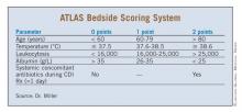 The five parameters are age, temperature, leukocytosis, albumin, and systemic concomitant antibiotic use, ATLAS for short. The first four are rated on a 0-2 scale; 2 is added to the score if the patient is on systemic antibiotics, 0 if not. ATLAS scores range from 0 to 10 (see box).