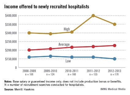 Average income was up 2.7% for hospitalists recruited in 2012-2013, compared with the previous year, according to a report from physician job placement firm Merritt Hawkins.