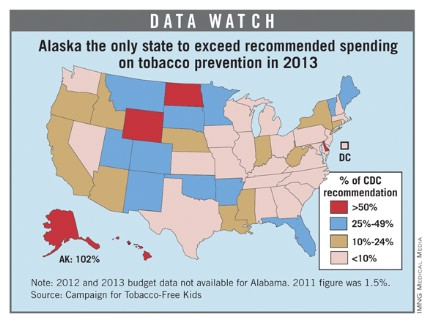 Alaska is the only state exceeding the Centers for Disease Control and Prevention’s recommended level of spending on tobacco prevention programs, according to a report from the Campaign for Tobacco-Free Kids.