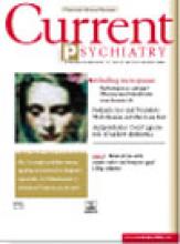 Welcome to Current Psychiatry, a leading source of information, online and in print, for practitioners of psychiatry and its related subspecialties, including addiction psychiatry, child and adolescent psychiatry, and geriatric psychiatry. This Web site contains evidence-based reviews of the prevention, diagnosis, and treatment of mental illness and psychological disorders; case reports; updates on psychopharmacology; news about the specialty of psychiatry; pearls for practice; and other topics of interest and use to this audience.