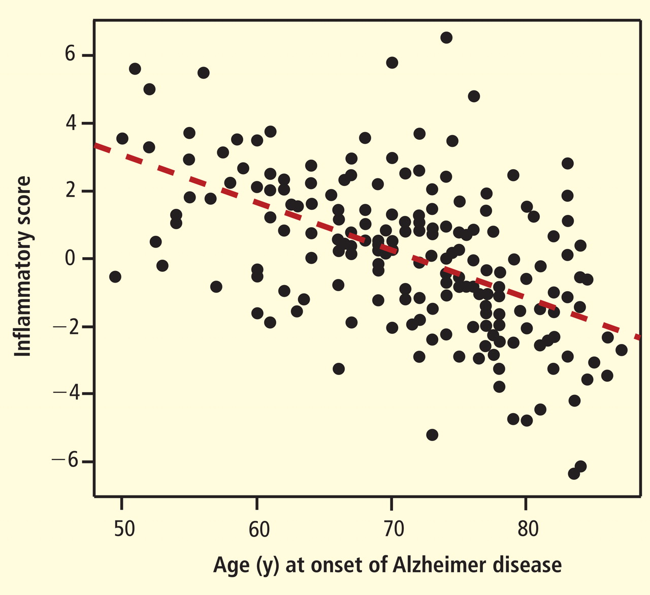 Degree of inflammation also correlated with Mini-Mental State Examination (MMSE) scores. Subjects with a high inflammatory score had a more accelerated decline in MMSE scores over a 3-year period than those with a low inflammatory score. The association was significant, although not as dramatic as the association between inflammation and age at onset of Alzheimer disease.