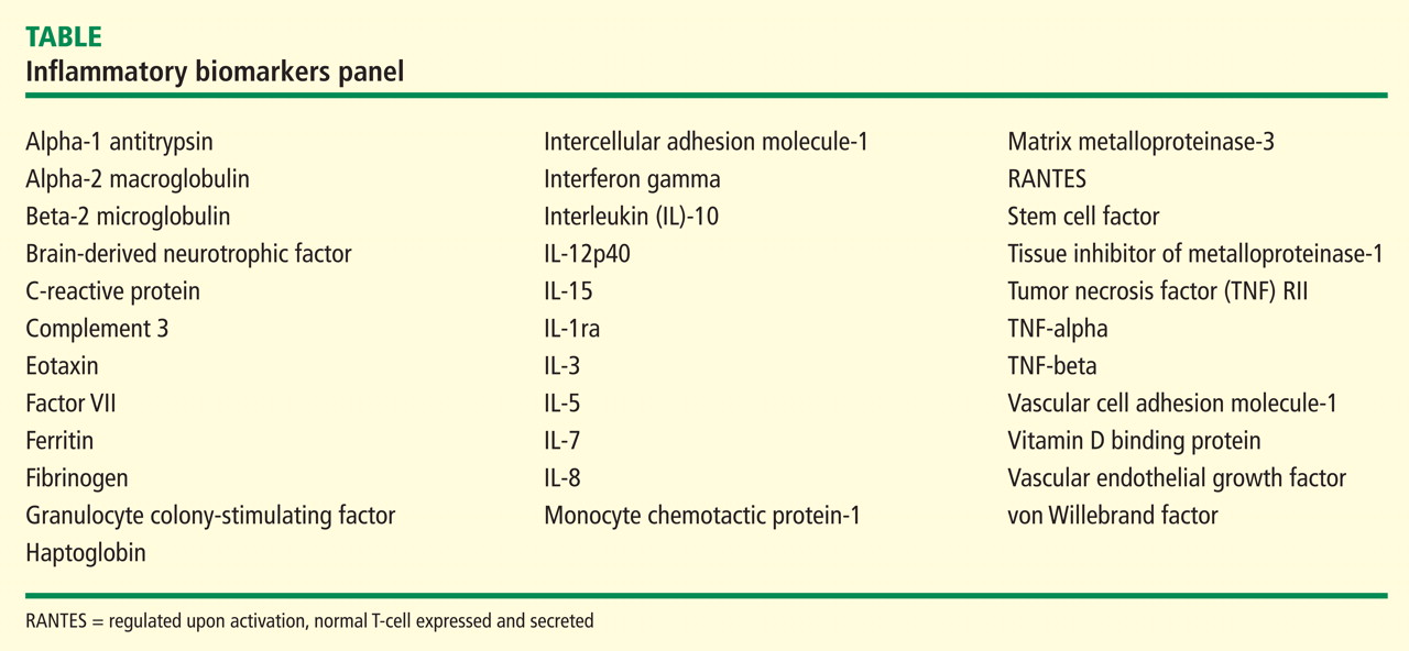 The Texas Alzheimer’s Research Consortium, composed of five medical centers, is pursuing a longitudinal, multi-institutional study of Alzheimer disease. The group recently published the results of a study assessing whether inflammatory markers were over- or underexpressed in patients with Alzheimer disease, and whether biomarkers could predict Alzheimer disease status and the age at onset of the disease.4 The analysis included 197 patients with Alzheimer disease and 203 control subjects. The evaluation consisted of cognitive assessment, DNA analysis for human genome-wide association studies, and protein microarray analysis from blood. Cardiovascular risk factors were also measured, including serum lipids and blood factors for diabetes risk. The goal was to better understand the pathophysiology of cognitive decline and predict conversion of mild cognitive impairment to Alzheimer disease.