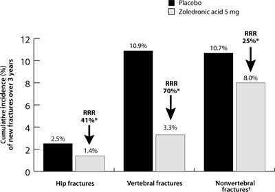 Intravenous zoledronic acid (5 mg, once yearly) reduced risk of fractures in the HORIZON-Pivotal Fracture Trial (n=7736)