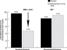 Oral bisphosphonates (alendronate, risedronate, and ibandronate) effectively reduce fracture risk at various skeletal sites, and are generally safe and well tolerated. In a 3-year clinical trial involving postmenopausal women with low femoral neck BMD and at least 1 baseline vertebral fracture, alendronate 10 mg/d, compared with placebo, reduced the risk of vertebral fracture by 47% (8% vs 15%; absolute risk reduction [ARR], 7%) and hip fracture by 51% (1.1% vs 2.2%; ARR, 1.1%).10 Risedronate 5 mg/d has been shown to reduce the risk of vertebral fracture compared with placebo by up to 49% (18% vs 29%; ARR, 11%)11 and nonvertebral fracture by up to 39% (5.2% vs 8.4%; ARR, 3.2%)12 in similar populations. Oral ibandronate reduced the risk of vertebral fracture by 52% (4.7% vs 9.6%; ARR, 4.9%) at doses of 2.5 mg/d compared with placebo; this study was not powered to assess hip fracture reduction, and there was a similar number of nonvertebral osteoporotic fractures in both groups.13