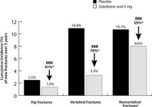 Zoledronic acid. The effectiveness of IV zoledronic acid, administered over a period lasting at least 15 minutes, was shown in the 3-year Health Outcomes and Reduced Incidence with Zoledronic Acid Once Yearly-Pivotal Fracture Trial (HORIZON-PFT).28 An annual infusion of zoledronic acid 5 mg in postmenopausal women with osteoporosis (n=3875) compared with placebo (n=3861) reduced the risk of hip fractures, vertebral fractures, and nonvertebral fractures by 41% (1.4% vs 2.5%; ARR, 1.1%), 70% (3.3% vs 10.9%; ARR, 7.6%), and 25% (8% vs 10.7%; ARR, 2.7%), respectively (P≤.002) (FIGURE 2). The numbers of patients needed to treat (NNT) to prevent 1 fracture at 3 years were 91, 13, and 37 for hip, vertebral, and nonvertebral fractures, respectively. IV zoledronic acid also significantly increased BMD and reduced bone turnover markers.
