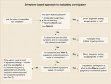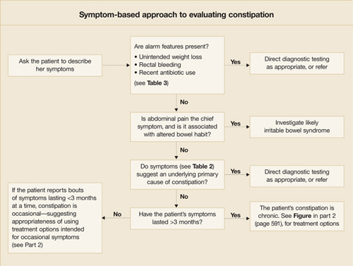 - A symptom-based approach is the best means for diagnosing chronic constipation. Extensive diagnostic testing is seldom necessary unless alarm features are present (C).