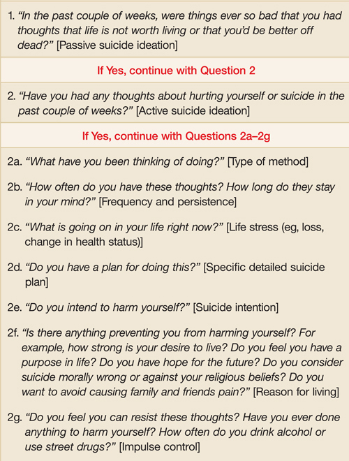 41. Hamilton GN. Suicide prevention in primary care: careful questioning, prompt treatment can save lives. Postgrad Med 2000;108:81-84,87.