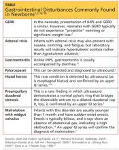 Typically, infants with nonbilious vomiting have either IHPS or GERD. Two factors to consider when evaluating the infant are its age and whether emesis is bilious or nonbilious. IHPS rarely causes bilious vomiting and most frequently occurs in infants between ages 3 and 6 weeks. Other GI disturbances that cause nonbilious emesis include adrenal crisis, gastroenteritis, pylorospasm, hiatal hernia, and preampullary duodenal stenosis.2 Malrotation or midgut volvulus may also be considered in the differential14 (see table1,2,14-16).